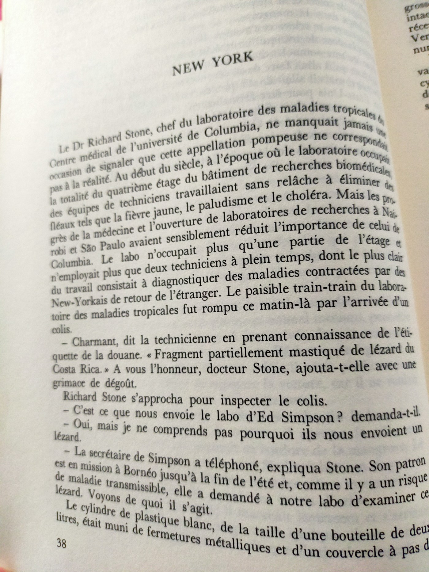 L’action de ce chapitre (qui n’apparaît pas dans le film de Steven Spielberg) reprend à New York, dans le laboratoire des maladies tropicales où travaille le Dr Richard Stone. La secrétaire du Dr Simspon, absent pour l’été, lui a envoyé le morceau de lézard arraché au singe hurleur sur la plage en lui demandant de l’identifier et de déceler s’il était porteur de virus.