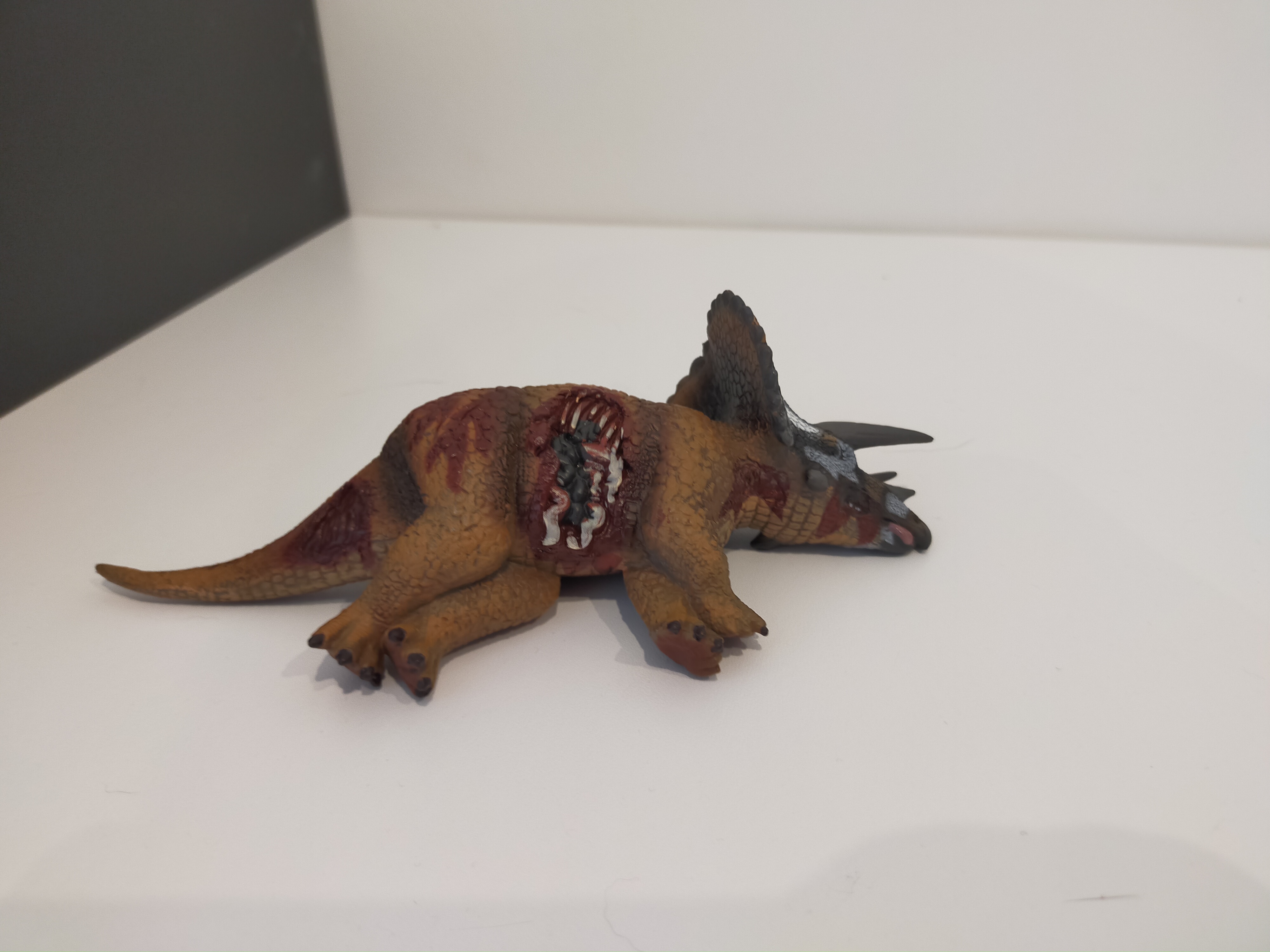 La plupart des gens qui contemplent mes vitrines trouvent ce type de figurines cruelles, mais eh, c’est la nature, il faut bien que les carnivores se nourrissent ! Voici donc la charogne de tricératops de la collection Collecta, une marque émergente depuis quelques années qui ne cesse de gagner en qualité.