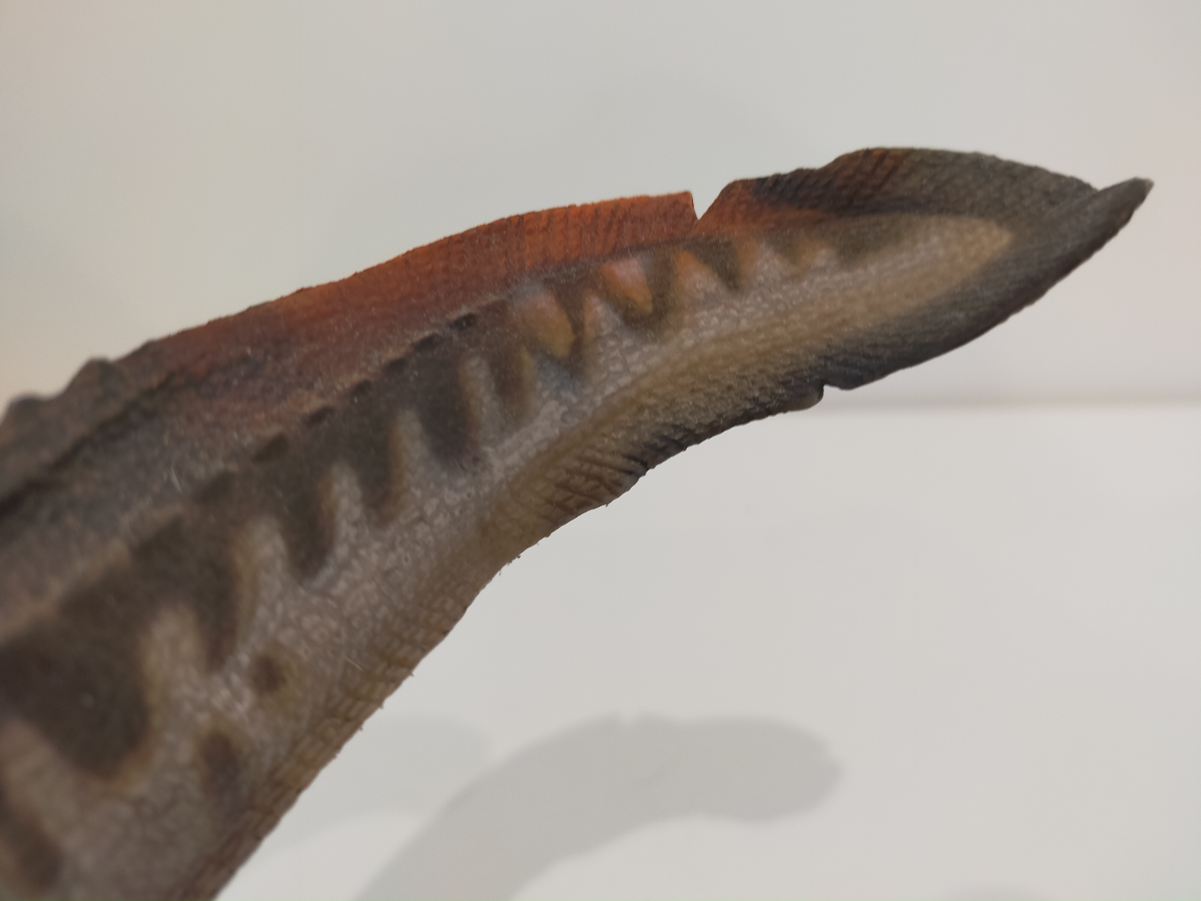 Ce spinosaure est juste CA-NON. Il n’y a pas d’autres mots, pour moi, c’est l’une des plus belles réussites de Papo de ces dernières années. ENFIN une marque prend acte des découvertes paléontologiques ayant révélé la vie semi-aquatique de cet animal. Je l’ai mitraillé pour vous montrer tous les détails.