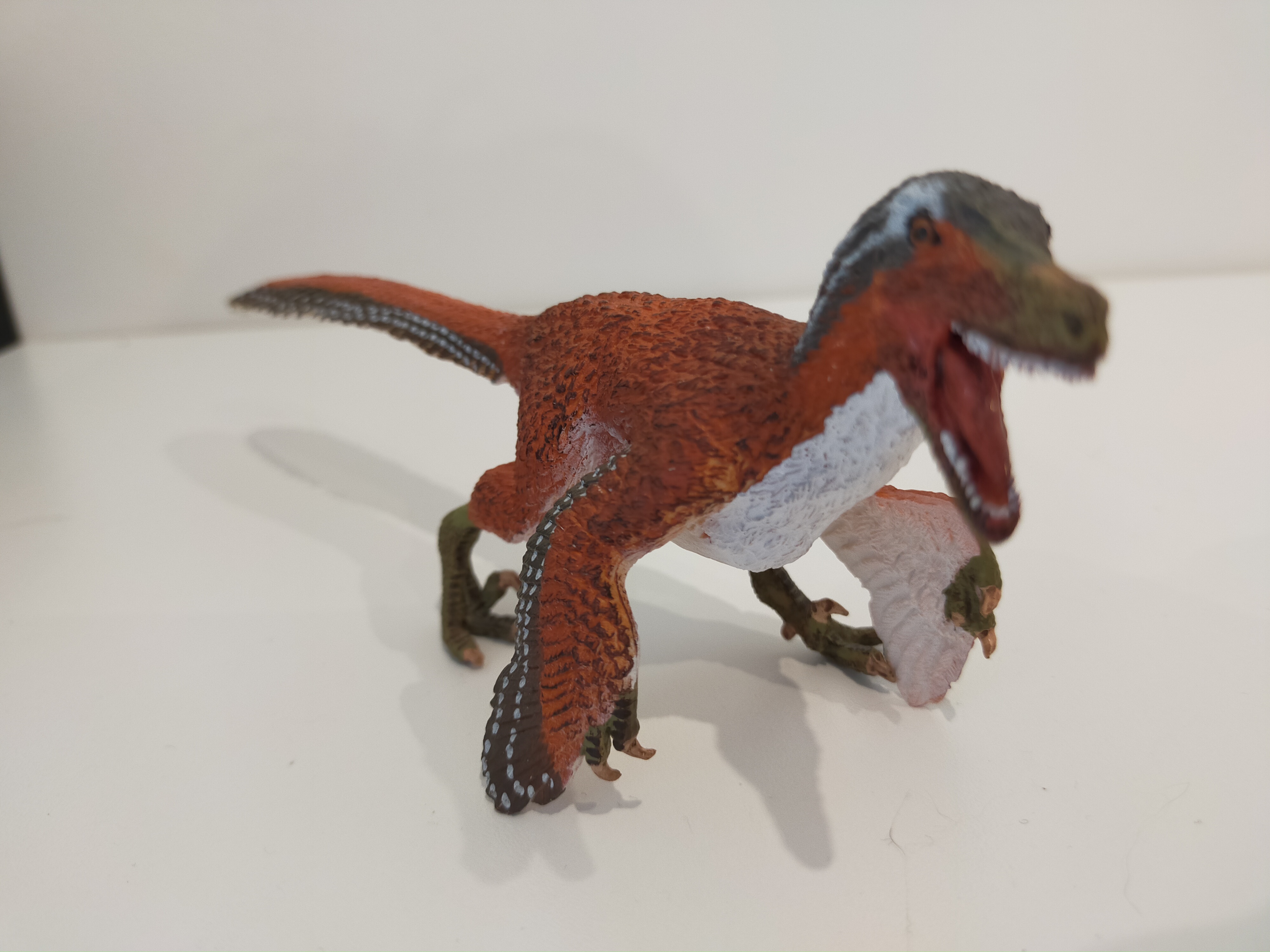 Je regrette en revanche que les plumes ne semblent pas aller jusqu’au bout du museau, car cette différence de coloris entre le bout de la gueule et le reste la ferait presque passer pour un bec alors que les vélociraptors possédaient des mâchoires. En outre, je trouve cette figurine un peu trop grossière pour être vraiment jolie (à moins que ça ne soit l’effet du orange sur moi, je n’apprécie pas particulièrement cette couleur et là, il faut dire qu’il est bien vif). Certains détails auraient pu être plus soignés également, par exemple les crocs qui n’ont malheureusement pas la qualité de ceux des figurines Papo (je vous invite à les comparer avec ceux du spinosaurus au-dessus ou du gorgosaure ci-dessous).