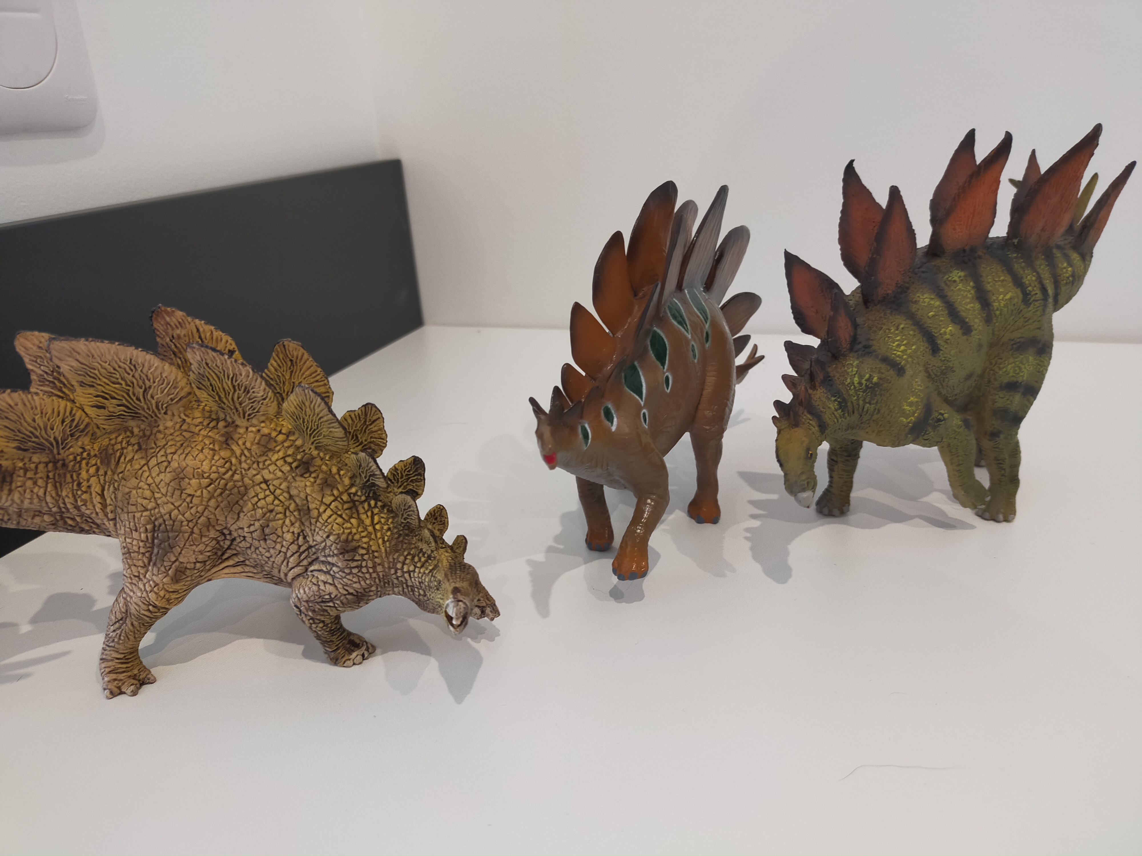 Parmi ceux-ci, commençons par faire le tour de ma famille de stégosaures, celle qui s’est le plus agrandie ces derniers temps (avec celle des allosaures, leurs prédateurs naturels au jurassique, et celle des tyrannosaures, chouchous des fabricants de figurines à cause de la popularité de la bête auprès du public).