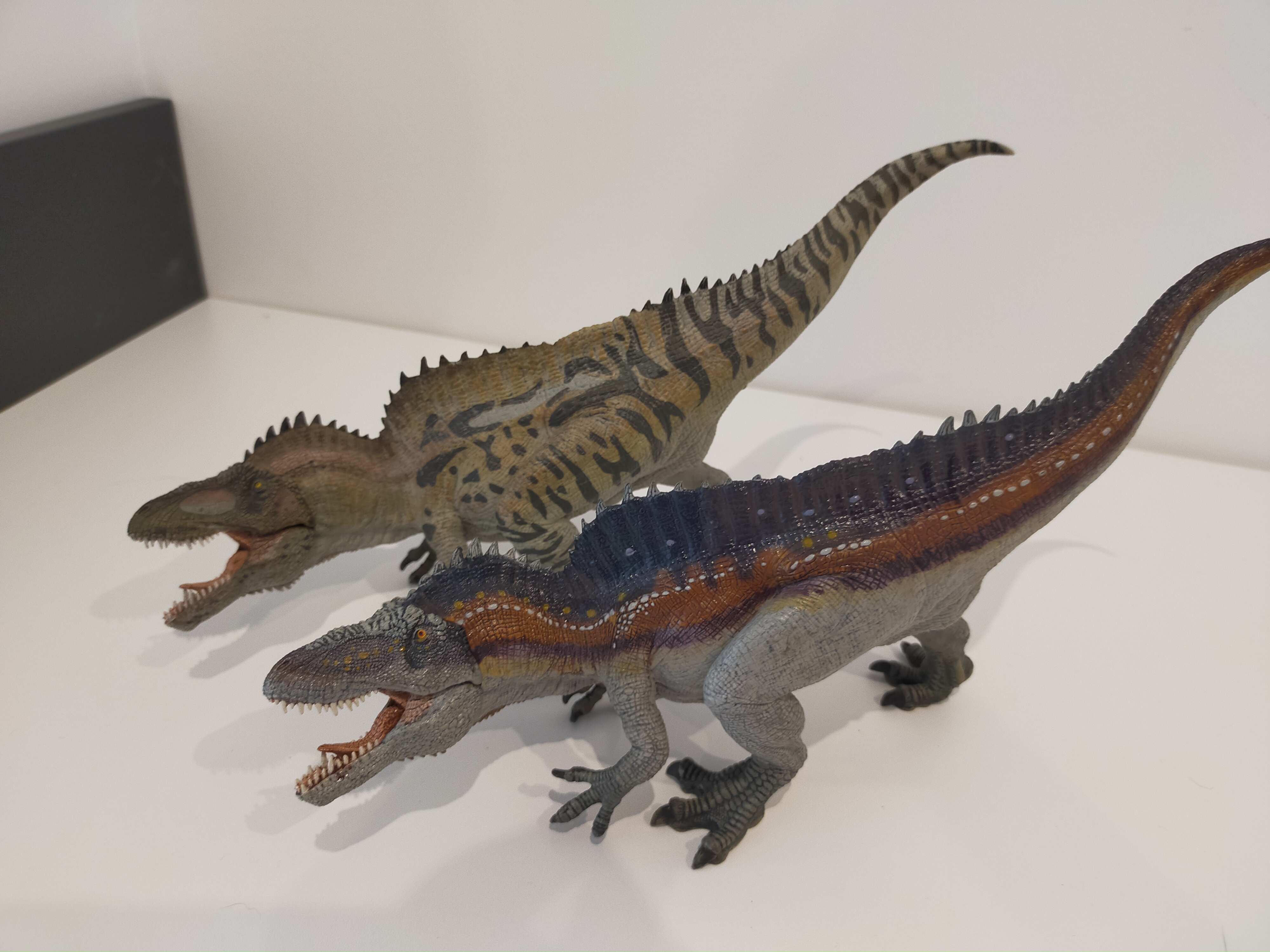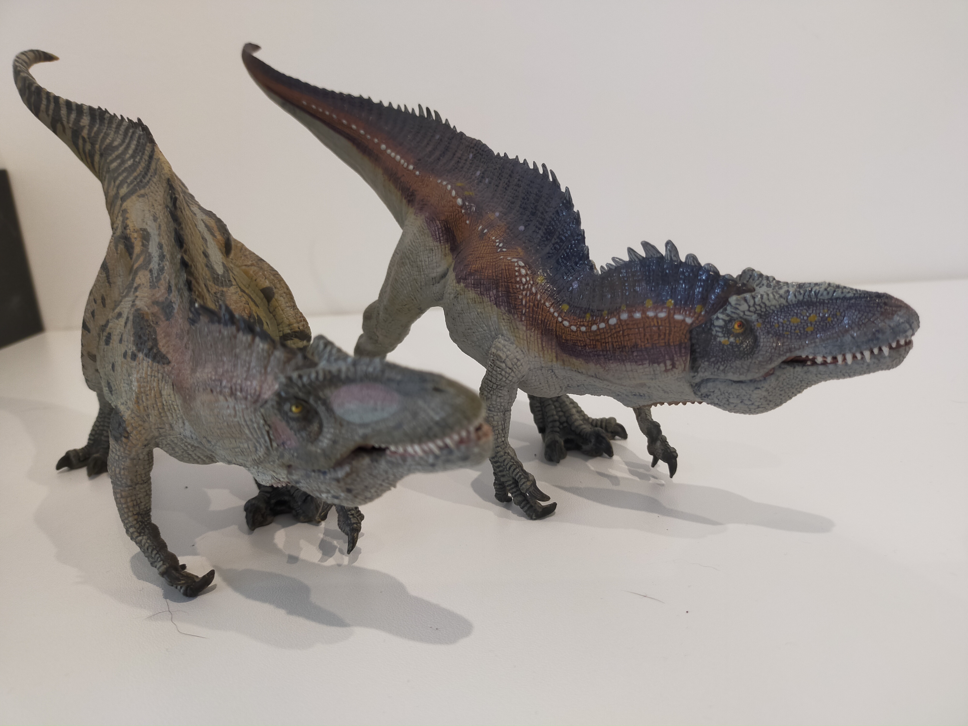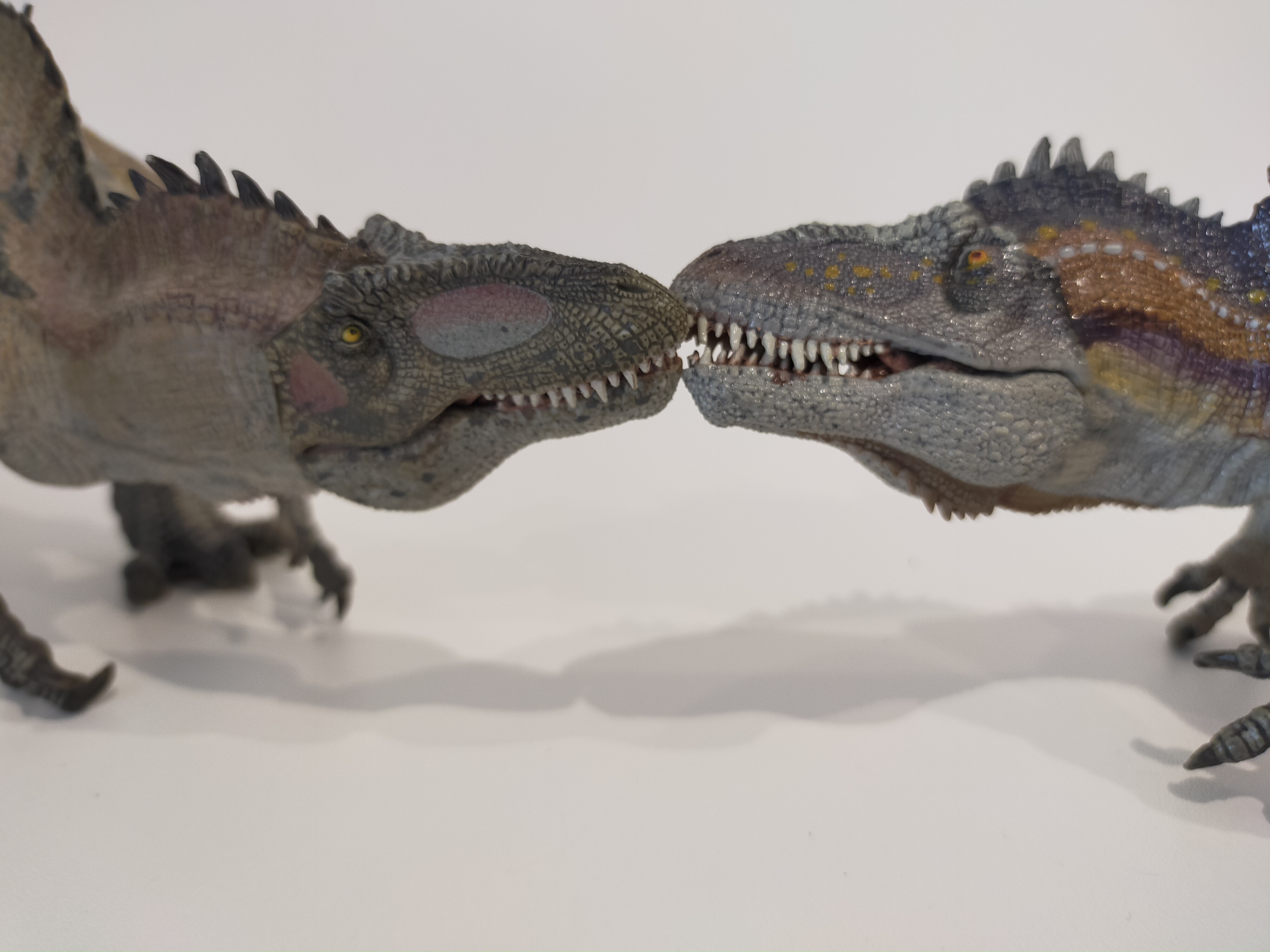 Autant vous dire que Thilliez se réjouit de cette arrivée. La rencontre a directement déclenché un coup de foudre (imaginez la scène de l’Amour Brille sous les étoiles version acrocanthosaurus) et voilà nos tourtereaux en train de roucouler. Je vous mets plusieurs photos des deux modèles l’un à côté de l’autre pour comparaison entre leurs coloris.
