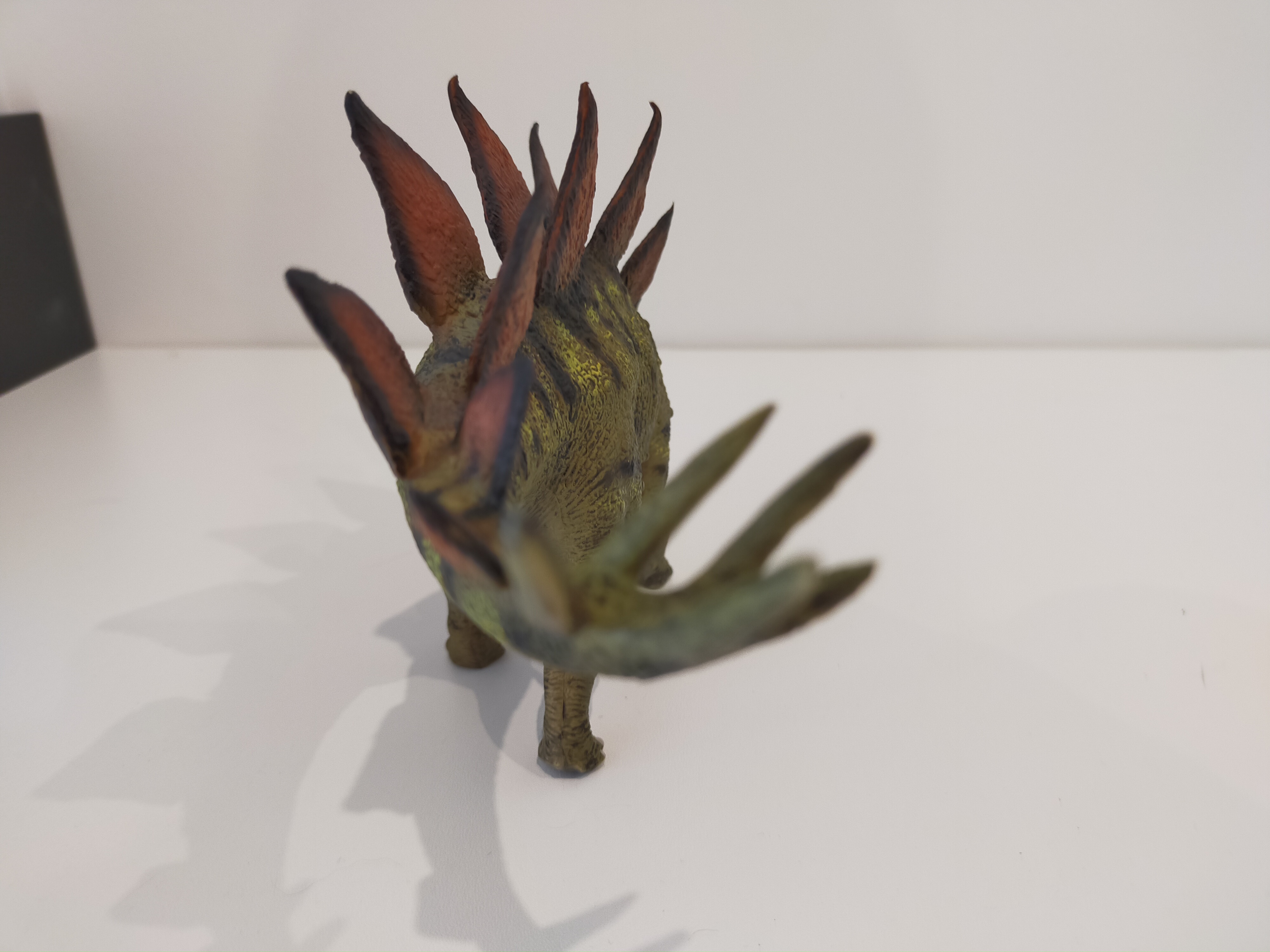 Tout d’abord, j’aime beaucoup sa couleur. Ce vert et ce noir paraissent très naturels, avec une coloration grise pour l’extrémité de son museau dur avec lequel il broutait vraisemblablement la végétation basse. Quant à la coloration rougeâtre de ses plaques dorsales qui les différencie nettement du reste du corps, je trouve qu’elle constitue une excellente idée. En effet, parmi les éventuels usages que l’animal aurait pu faire de ces plaques figure la possibilité qu’il s’en soit servi pour effrayer les prédateurs en y faisant affluer sa circulation sanguine, leur conférant ainsi une couleur rouge intimidante.