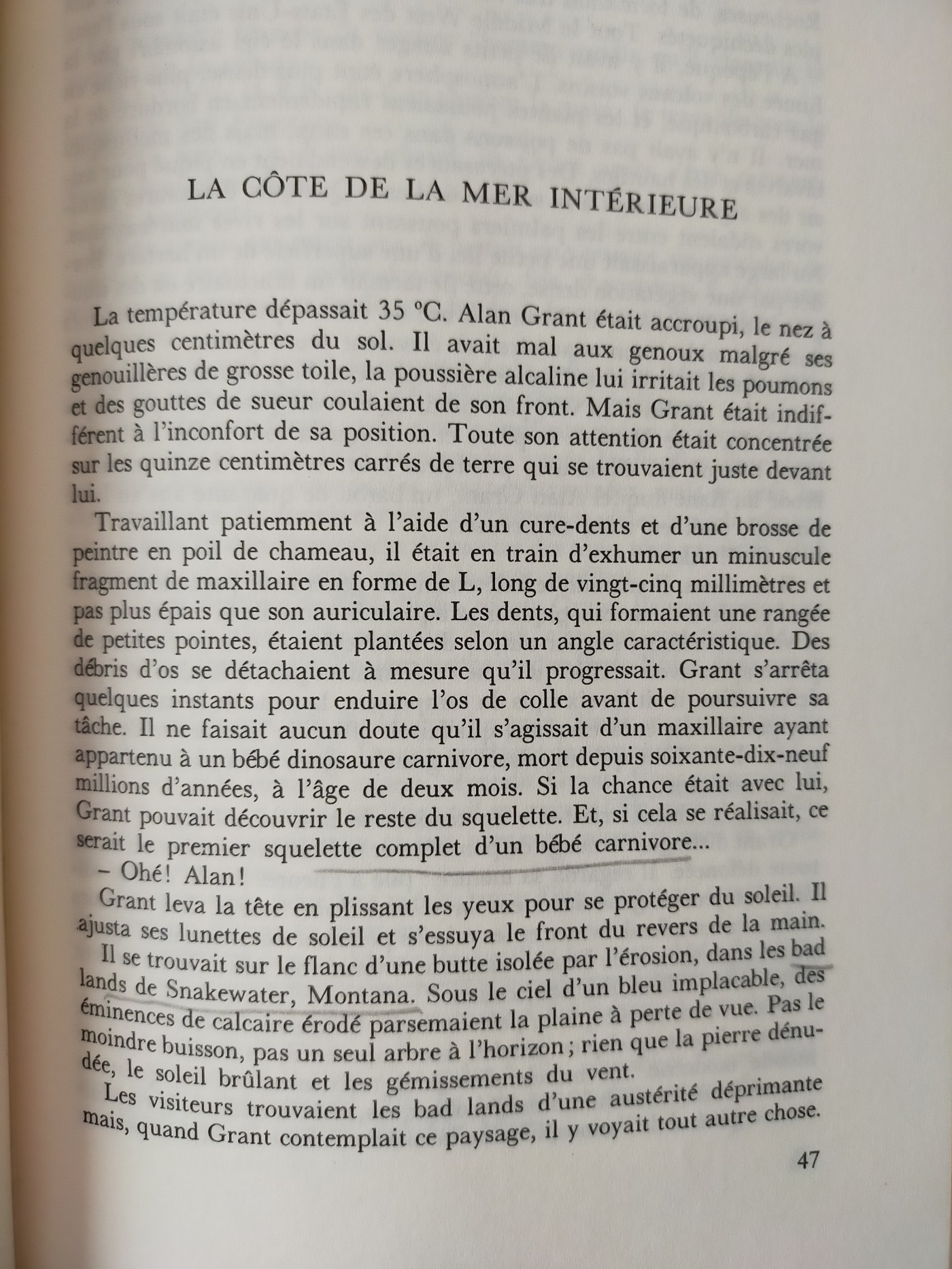 La Côte de la mer intérieure nous présente deux des principaux protagonistes de la saga : Alan Grant (Sam Neill), un paléontologue s’intéressant de près aux hadrosaures (aussi appelés « dinosaures à bec de canard ») et aux vélociraptors, et Ellie Sattler (Laura Dern), une paléobotaniste. Et quel meilleur endroit pour faire la connaissance de ces deux là que leur terrain de prédilection : un site de fouilles ! Celui-ci se situe dans les bad lands dans le Montana, connues pour leur beauté hostile et saisissante et surtout pour leurs sols riches en ossements de dinosaures. Nul ne s’étonnera qu’Alan Grant s’y sente dans son élément comme en témoigne ce passage :