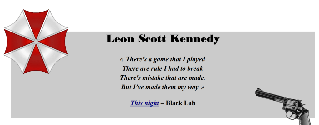 Or, il est tout bonnement impossible pour moi de jouer de façon intensive et fouillée un personnage sans avoir au préalable posé les bases de son histoire et de sa personnalité. Déformation professionnelle oblige, j’ai donc composé une fiche de personnage à ce bon vieux Leon Kennedy. Elle reprend sa vie depuis les évènements de Raccoon city dans Resident Evil 2, tandis qu’il est âgé de seulement 21 ans, jusqu’à l’endroit où nous en sommes en RP. Leon a alors 27 ans.